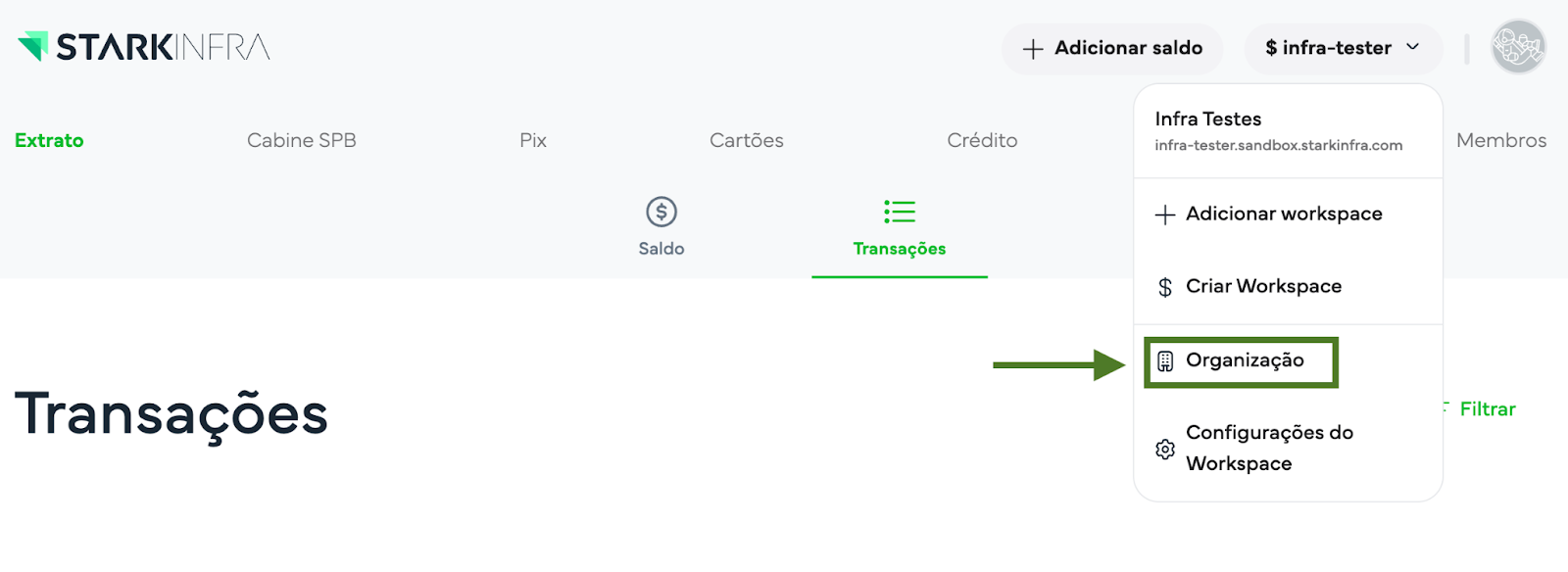 1. Na lateral direita superior clique no nome do seu Workspace e selecione Organização: