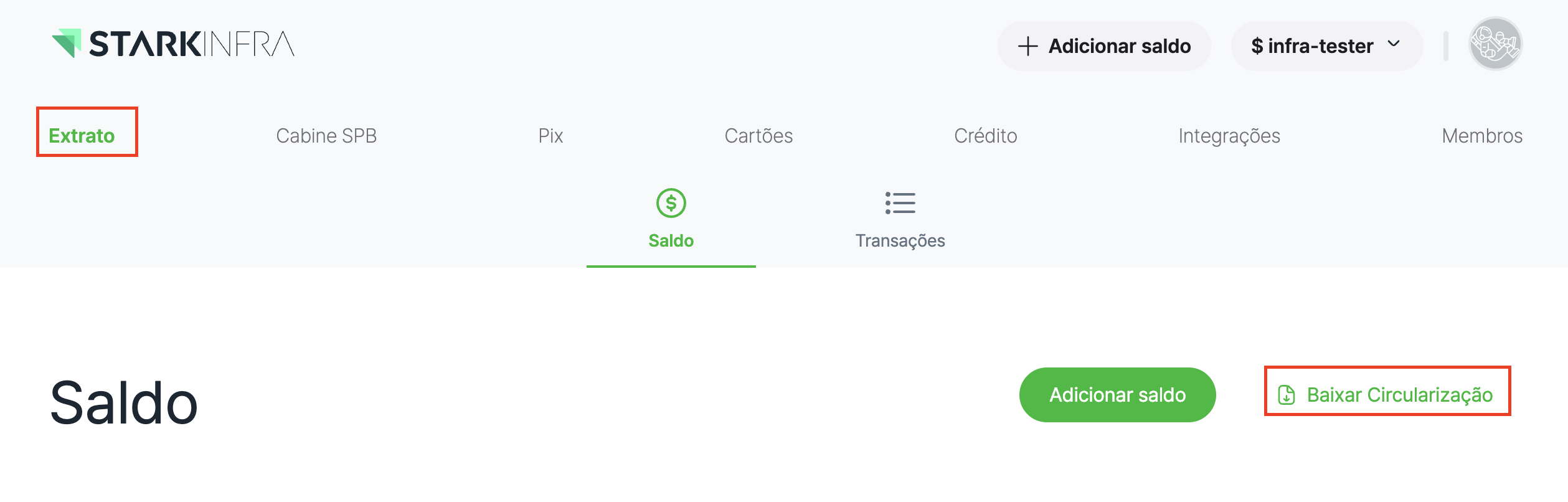 Na tela de Extrato > Saldo no canto direito da tela, clique no botão Baixar Circularização.