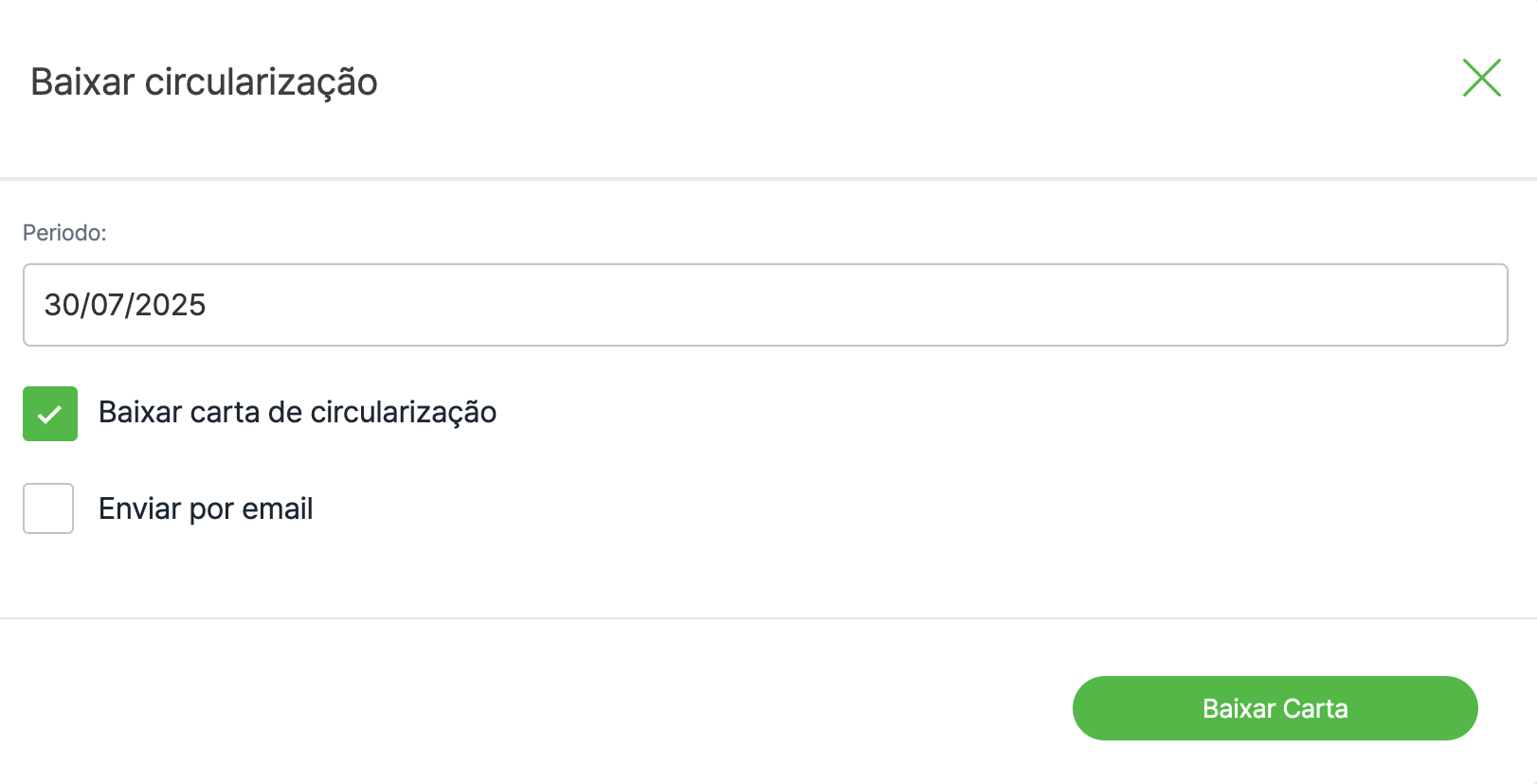Depois, será necessário escolher a forma de recebimento da circularização (baixar ou e-mail) e o período que deseja (data base).